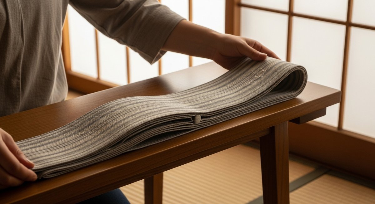 博多織は比較的シワになりにくい素材ですが、結び目の部分は多少のシワが残ることがあります。これを解消するために、アイロンを頻繁にかけるのはあまりおすすめできません。基本的には、陰干しをした後に手で優しくシワを伸ばし、正しく畳んで重みをかけることで、自然にシワは解消されます。畳む際は、折り目が毎回同じ場所にならないよう、少しずつずらす工夫をすると生地への負担が軽減されます。