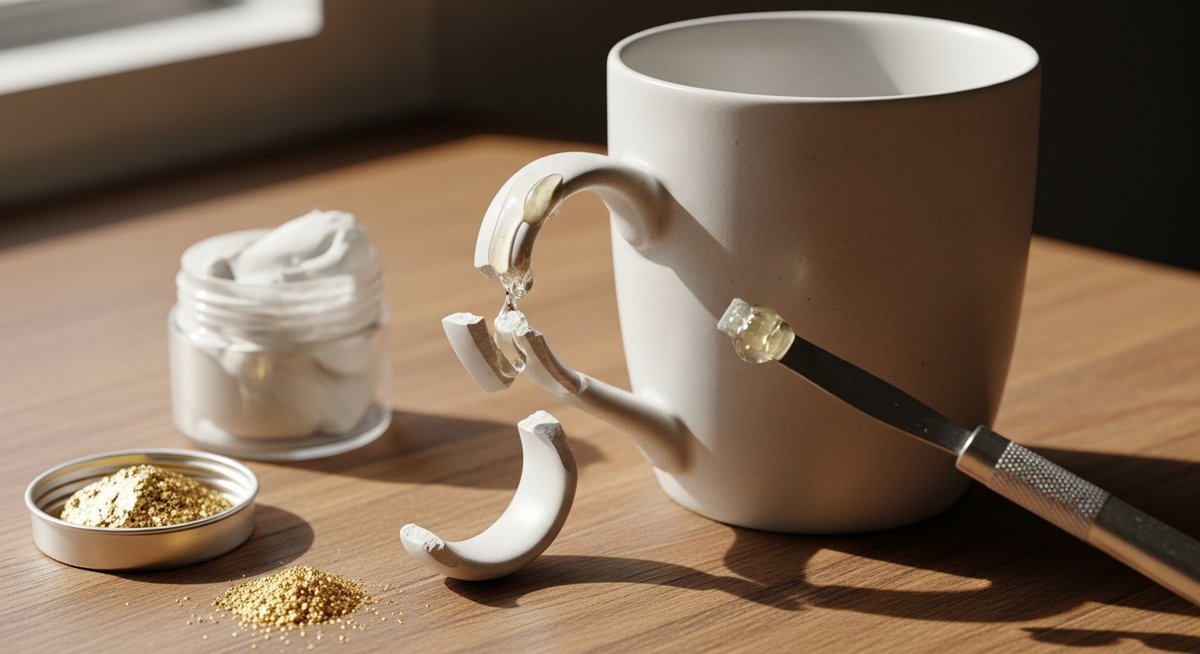 特に、取っ手の接合部分は視線が向きやすい場所です。ここを美しく仕上げるためには、素材の「肉痩せ」が少ないものを選ぶのがコツです。乾燥して体積が減ってしまう素材だと、せっかく平らに塗っても後から凹みが生じてしまいます。エポキシ系のパテや接着剤は比較的肉痩せが少ないため、面を平滑に出しやすく、プロのような仕上がりを目指すことができます。表面を磨き上げることで、元の陶器のような光沢を再現できる素材も人気があります。