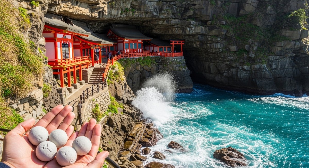 本殿前の断崖下には、亀の形をした巨大な岩「霊石・亀石」が横たわっています。この岩の背中にある窪みに向かって、「運玉」と呼ばれる小さな素焼きの玉を投げ入れ、見事に入れば願いが叶うと言い伝えられています。運玉投げは鵜戸神宮を訪れる参拝者の多くが挑戦する、非常に人気のある儀式です。